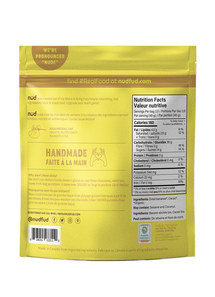 These have a thin 100% dark chocolate and cacao coating. Because there are no sweeteners in the chocolate, we don’t suggest sucking it off, or letting it melt in your mouth for a long period (it will be bitter), unless you are hardcore like that! We like to chew these so the cacao mixes with the sweetness of the banana.