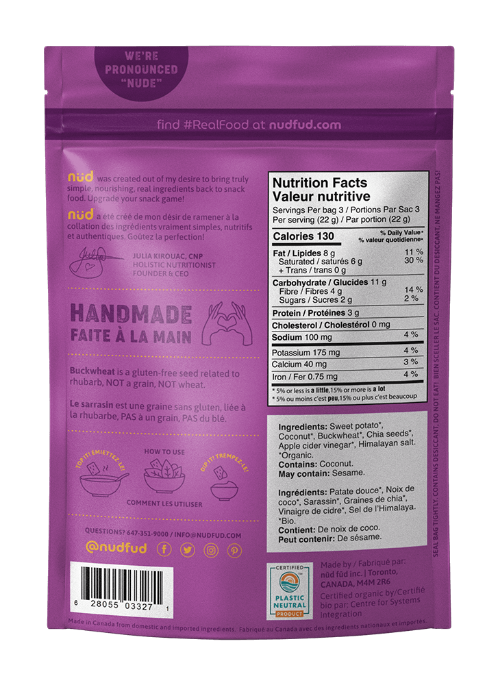 Made from only pure, no BS ingredients like fresh sweet potatoes, whole chia seeds, coconut, and buckwheat. Gut-friendly, nut-free, and packed with filling good fats, 3g protein and 4g fibre per serving.